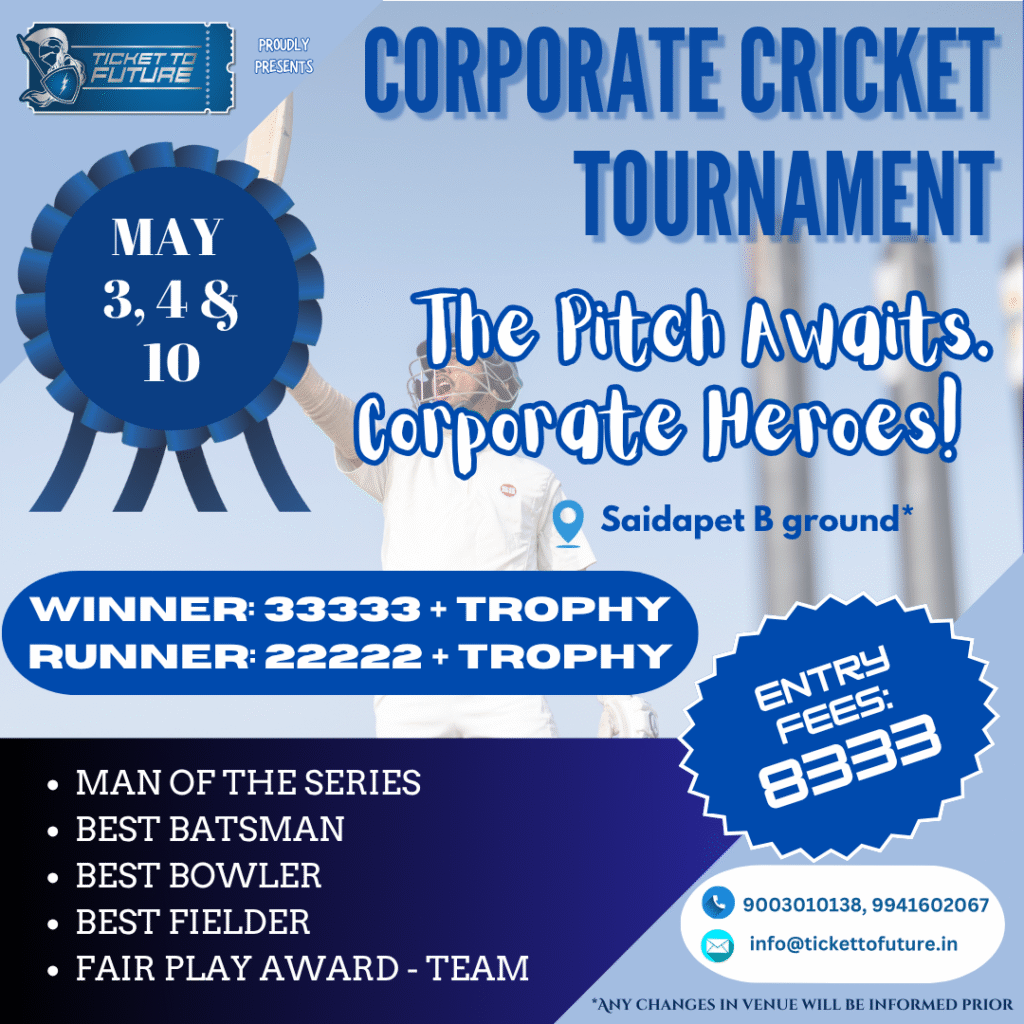 Get ready to bring your team’s best game to the pitch at Saidapet’s B Ground! May 3, 4, and 10, 2025—mark your calendar for the inaugural T2F Corporate Cricket Tournament. May the best team win! 🏆