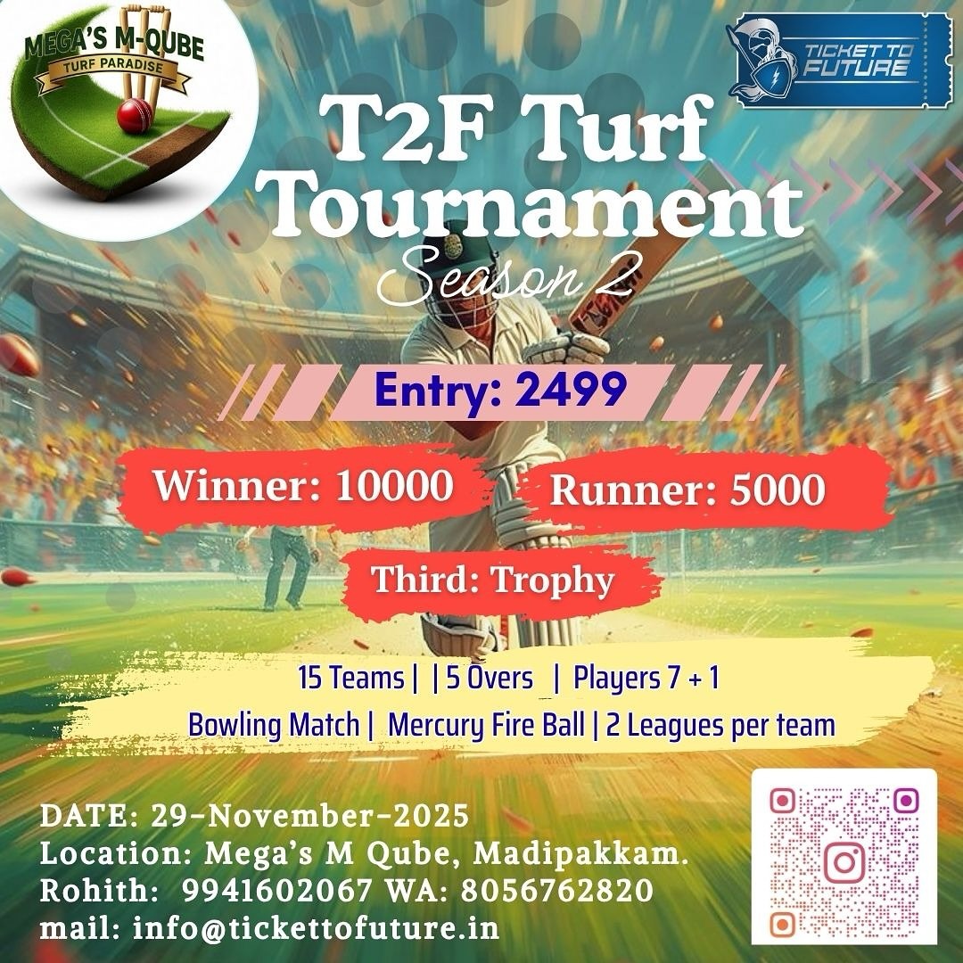 Don’t miss out on the inaugural T2F Turf Cricket Tournament—Season 2 2025! Bring your A‑game, and may the best team win! 🏆